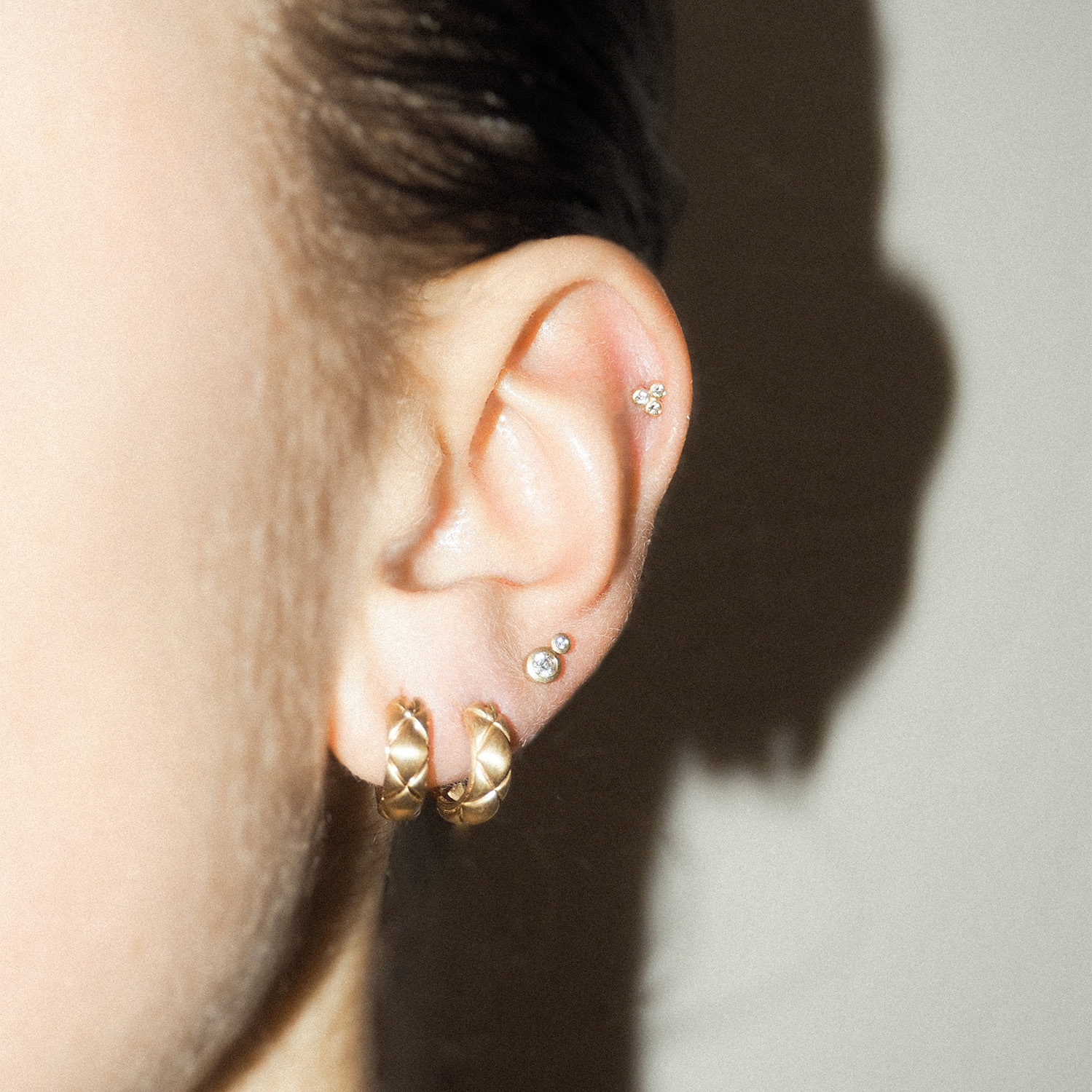 Vores piercingsmykker er udviklet med en lukket flad bagside af massivt guld, således at piercingen ikke fanger skidt eller irriterer. Smykket er i to dele, som er skruet sammen fra fronten. Sørg for at skrue front-stykket med uret en gang imellem, for at undgå at det går løs.